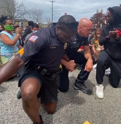 Dva policajca, jedan belac, a drugi Afroamerikanac, iz policijske stanice Oušn siti u Nju Džersiju zajedno sa demonstrantima su kleknuli na zemlju, držeći se za ruke.