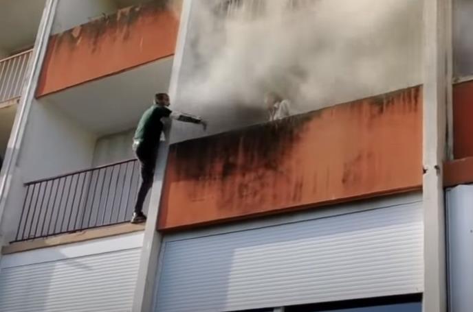 Naime, dok je ovaj starac stajao na balkonu, a iza njega se video gusti dim, trojica mladića su se neverovatno brzo popela po zidu zgrade.