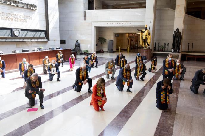Članovi američkog Kongresa iz Demokratske stranke danas su, pre nego što su predstavili predlog za reformu policije, održali minut ćutanja i zatim klekli na jedno koleno, što je postao simbol protiv policijske brutalnosti i nasilja, i klečali osam minuta i 46 sekundi u znak poštovanja prema Džordžu Flojdu i drugim Afroamerikancima koji su "nepravedno izgubili život".