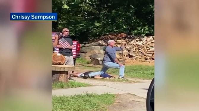 Oni prolaze pored privatnog poseda a na snimku se vidi čovek kako kleči na vratu drugog čoveka i viče na demonstrante.