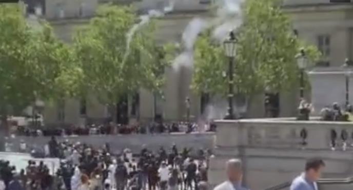 Protest desnice naleteo je na antirasističke demonstrante na Trafalgar trgu. Vide se suparničke grupe kako se međusobno gađaju raznim predmetima i vatrometom, ali policija ih je odmah odvojila.