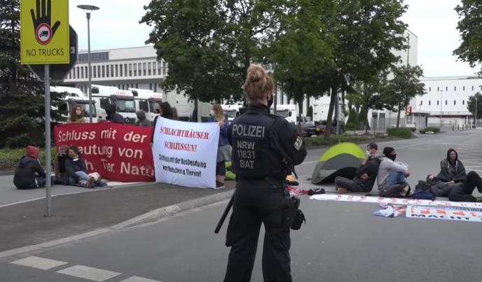 Demonstranti su danas blokirali prilaz fabrici mesnih proizvoda "Tenis" u mestu Reda-Vajdenbruk, koja je poslednjih nedelja na meti kritika zbog nehumanih uslova u kojima rade radnici sa istoka Evrope, što je dovelo do izbijanja korona virusa u tom regionu.