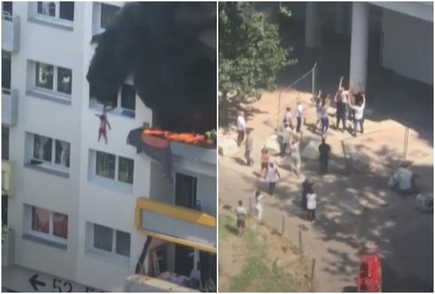 Na snimku se vidi kako jedan od dečaka pada sa trećeg sprata zahvaćenog požarom dok gusti dim izbija sa balkona i prozora.