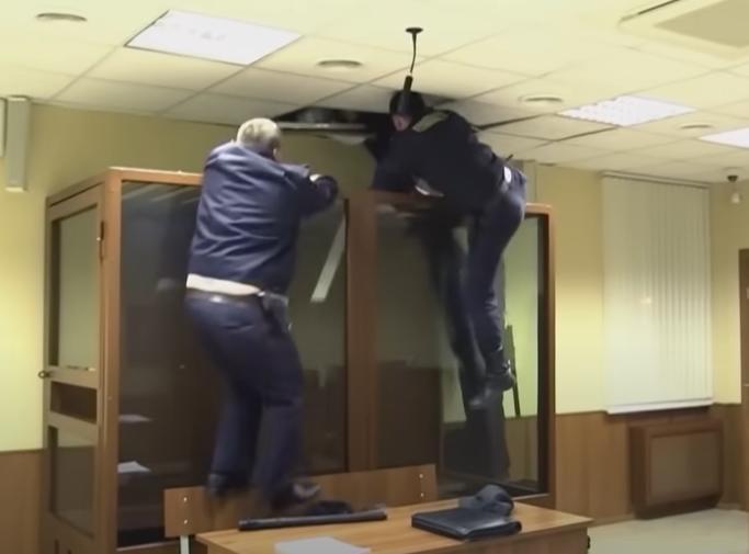 Optuženi je jednom pokušao da izađe iz "kaveza", ali su ga policajci smirili. I kada se videlo da je opasnost od bekstva prošla, Rus se odjednom našao na vrhu kaveza pokušavajući da kroz plafon pobegne iz sudnice.