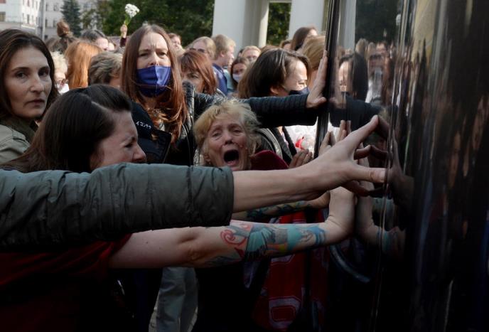 Neke su udarale u šerpe, dok su druge skandirale "Vratite nam Mašu", aludirajući na uhapšenu opozicionu liderku Mariju Kolesnikovu. Ona je uhapšena početkom nedelje pošto je pružila otpor prisilnom proterivanju iz zemlje, pocepavši pasoš.