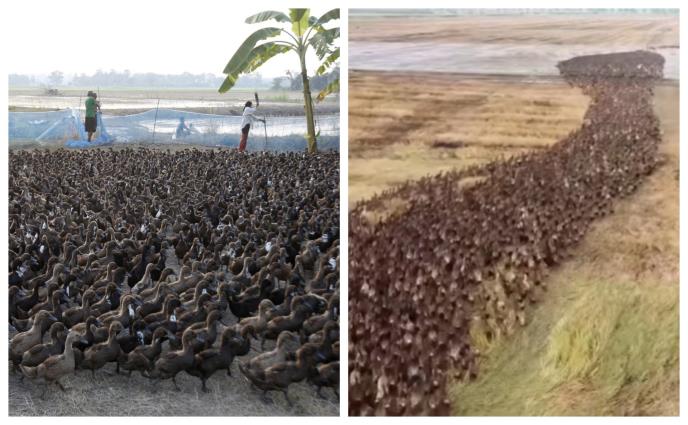 Nakon žetve pirinča u ovom delu centralnog Tajlanda, jato od oko 10.000 pataka pušta se farme i instinktivno hrli ka poljima kako bi se u slast najelo štetočine poput puževa koji se u njima kriju.
