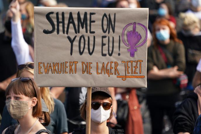 Noseći zaštitne maske, u skladu sa pravilima uvedenim zbog korona virusa, oko 5.000 ljudi nosilo je transparente s natpisima "Imamo prostora!" "Šta još mora da se dogodi?", "Evakuišite odmah Moriju", "Sram te bilo, EU" i "Skloništa, ne zatvori".