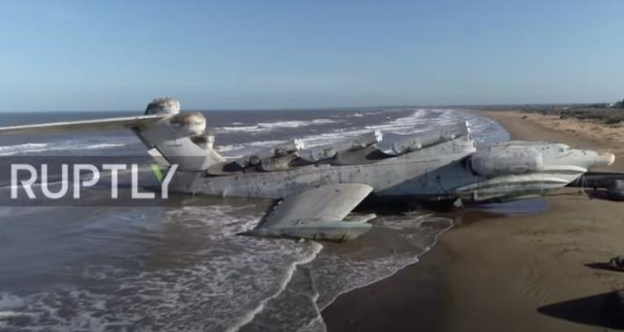 Snimak jedinstvenog sovjetskog letećeg ratnog broda, ekranoplana, načinjen je iz ptičje perspektive na plaži u ruskoj republici Dagestan, pruža neverovatan pogled na ovu moćnu borbenu mašinu iz vremena Hladnog rata.