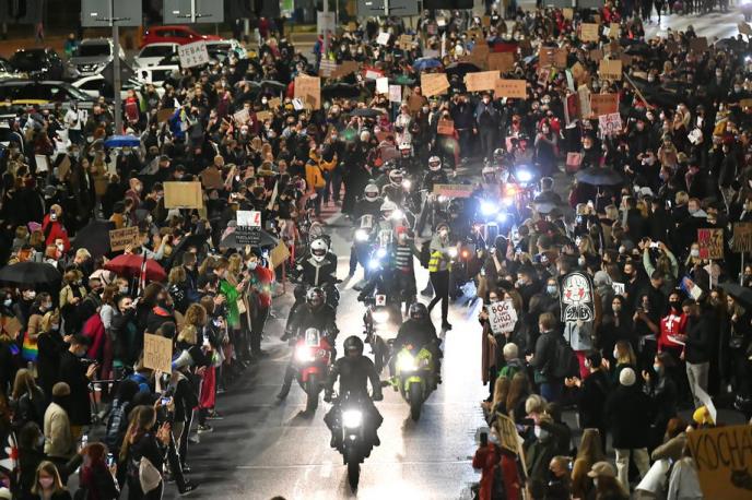 Uprkos strogim pravilima koja ograničavaju okupljanje više od pet osoba tokom pandemije korona virusa, demonstranti su prošli centralnim ulicama Varšave noseći crne kišobrane, simbol protesta za pravo na abortus i transparente na kojima je pisalo, između ostalog, i "Bog je žena".