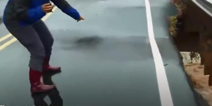 Robertsova je kleknula na most u okrugu Aleksander i pokazala gledaocima da je usred bujne kiše deo puta polako tonuo.