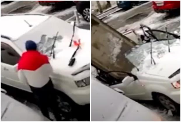 Kao što se može videti, muškarac je čistio kola od snega i leda, kada je primetio da nešto nije u redu. Video je da nešto pada i brzo se sklonio, a betonska ploča je potpuno smrskala automobil.