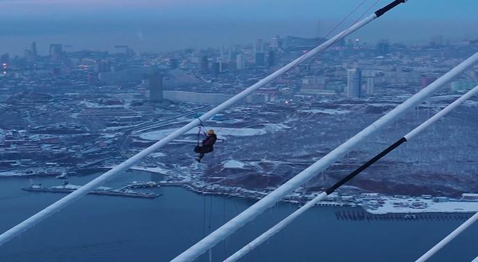 Dron je snimio rad alpiniste, koji je čistio stubove mosta od leda. Visina konstrukcije je 324 metra.