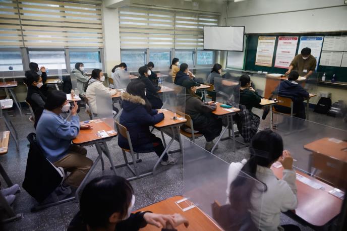 Skoro pola miliona južnokorejskih srednjoškolaca danas je počelo polagaganje prijemnog ispita za fakultet u odvojenim plastičnim barijerama u učionicama, dok su oni sa kovid-19 polagali ispit u bolnici.