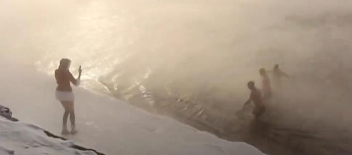 U jezeru je plivalo oko desetak ljudi uprkos tome da temperatura ovde može da se spusti i 35 stepeni Celzijusovih ispod nule.
