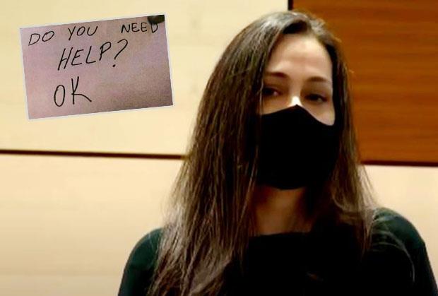 Odlučila je da napiše poruku koja je glasila: "Da li ti treba pomoć? OK", a stala je iza njegovih roditelja kako bi dečak mogao da odgovori.