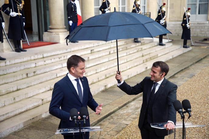 Dok je slovački premijer Igor Matovič govorio pred novinarima pre sastanka sa predsednikom Francuske, jedna pomoćnica je prišla Makronu i dala mu crni kišobran. Francuski lider je uzeo kišobran i otvorio ga iznad svog gosta iz Slovačke.