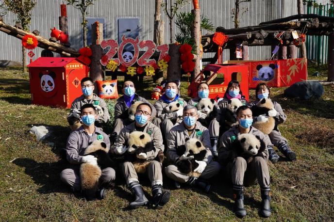 "Novorođene pande iz okota 2020... vam žele srećnu Novu godinu i mnogo sreće u godini vola", uzvikivali su čuvari sa pandama u rukama.