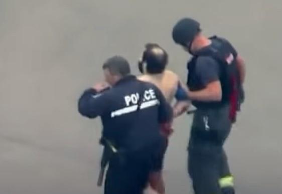 Na video snimcima sa mesta događaja može se videti kako policajci odvode muškarca, koji ima samo bokserice na sebi, i ubacuju ga u vozilo Hitne pomoći.