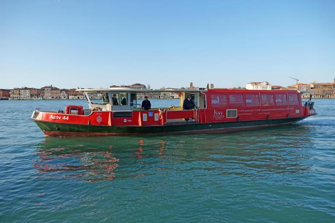 Čuveni "vaporeto" neobične crvene boje pristao je na mestu na kome obično stoje brodovi za turiste, dok su građani mirno stajali čekajući svoj red za vakcinaciju, prenosi Ansa.