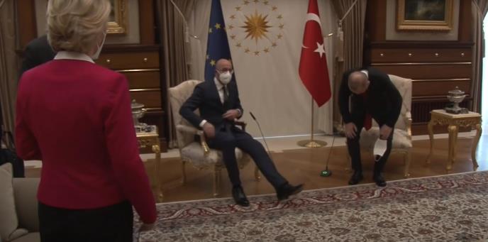 Vidno iznervirana Nemica samo je kratko rekla "ehem" i pokazala na zauzeta mesta nakon kada je videla da su za sastanak u pozlaćenoj sobi predsedničkog kompleksa pripremljene samo dve stolice na koje su se već smestili Erdogan i Šarl Mišel, predsedavajući Evropskog saveta.