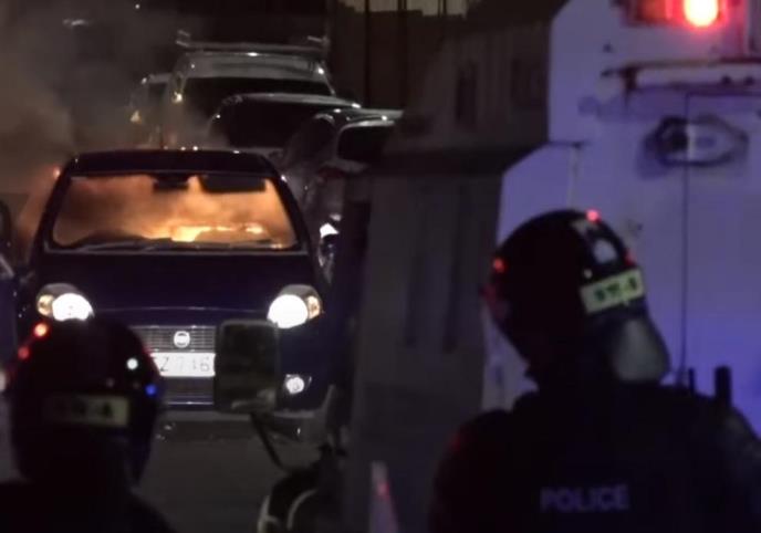 U jednom trenutku, policijski kornon je napadnut i automobilom, koji su demonstranti zapalili i gurnuli prema policajcima. Slična taktika krađe automobila i paljenja korišćena je tokom napete srede uveče, kada su demonstranti u zapadnom Belfastu uništili autobus.