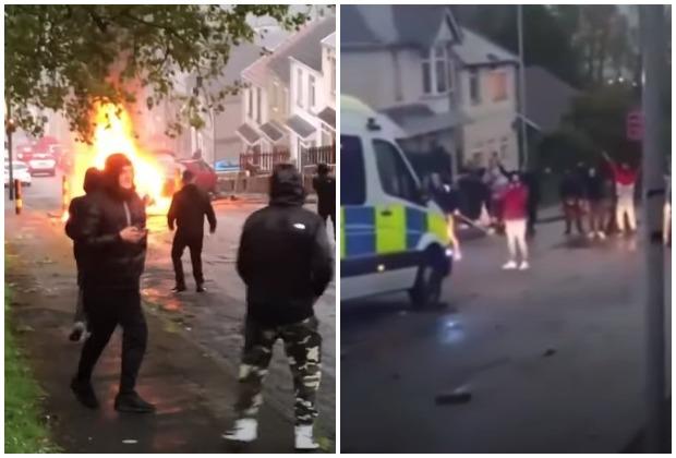 Grupa ljudi je skandirala i pevala u četvrtak uveče, dok je automobil gurnut nizbrdo, ka drugom automobilu koji je goreo, preneo je "Vels onlajn".