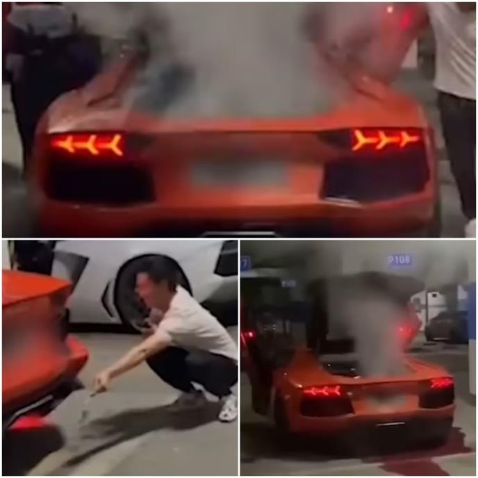 Na snimku se vide šokirani momci kako gledjau plamen koji zahvata zadnji deo njihovog skupog aventador modela. Snimak spaljivanja lamborginija napravljen je u Kini.