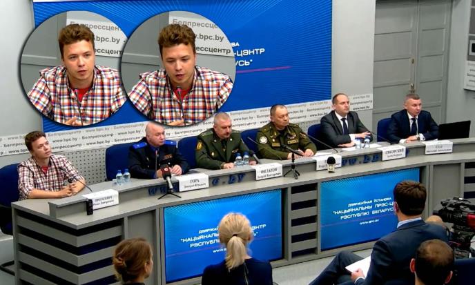 Protašević koji je sedeo između četiri policajaca, rekao je da ga niko nije terao da sarađuje sa vlastima i da je dobrog zdravlja, nakon hapšenja u Minsku kada je preusmeren avion ''Rajanera''.
