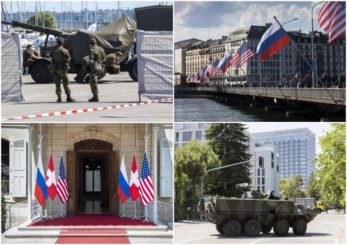 Na ulicama Ženeve je vrlo malo vozila, pa je zato grad neobično tih za radni dan, dok su policijski punktovi postavljeni u zatvorenim delovima ulica, a trenutno je nemoguće prići do mosta Monblan, koji je ukrašen zastavama Rusije i SAD za ovu priliku.