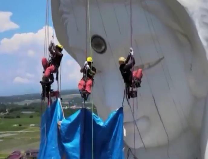 Za ovaj poduhvat bila su potrebno četiri radnika i tri sata kako bi se na spomenik visok 57 metara postavila maska.