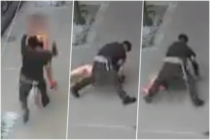 Naime, na snimku se može videti kako muškarac prati ženu, sustiže je i baca je na pločnik.