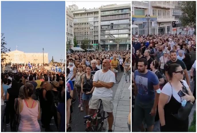 U Atini su demonstranti skandirali " Dalje ruke od naše dece“ i podigli transparent s natpisom „Kažemo ne vakcini sa otrovom“, prenosi AP.