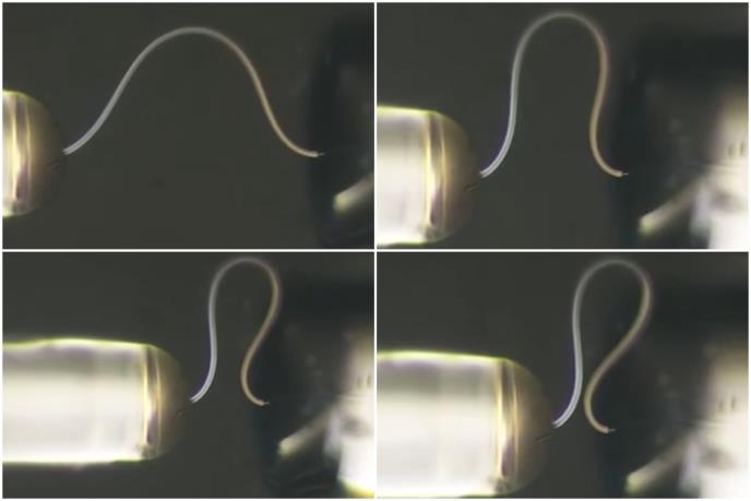 Zatim su snizili temperature na između minus 70 i minus 150 stepeni Celzijusovih i pokušali da saviju ledena vlakna. Ustanovili su da se vlakna na minus 150 stepeni mogu saviti u gotovo kružni oblik, radijusa 20 mikrometara; što ukazuje na maksimalno elastično naprezanje od 10.9 odsto.
