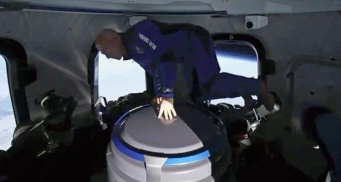 Baš kao i Ričard Branson i njegovi putnici koji su devet dana ranije obavili slično putovanje sa brodom "Virdžin galaktika", Bezos i njegovi putnici odvezali su se i prevrtali u vazduhu. Kako se vidi na snimku iz unutrašnjosti kapsule objavljenog nakon leta, osnivač "Amazona" – koji je ovu kompaniju napustio kako bi se posvetio "Blu oridžinu" i svemirskom turizmu – sa posadom se divio nedostatku sile gravitacije kad su dosegli visinu od preko 107 km.