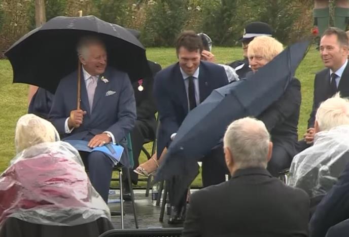Boris Džonson je uhvaćen u borbi sa kišobranom dok je po veoma vetrovitom i kišnom vremenu zajedno sa princom Čarlsom prisustvovao otvaranju spomenika policajcima u Nacionalnom memorijalnom parku u Stafordširu.