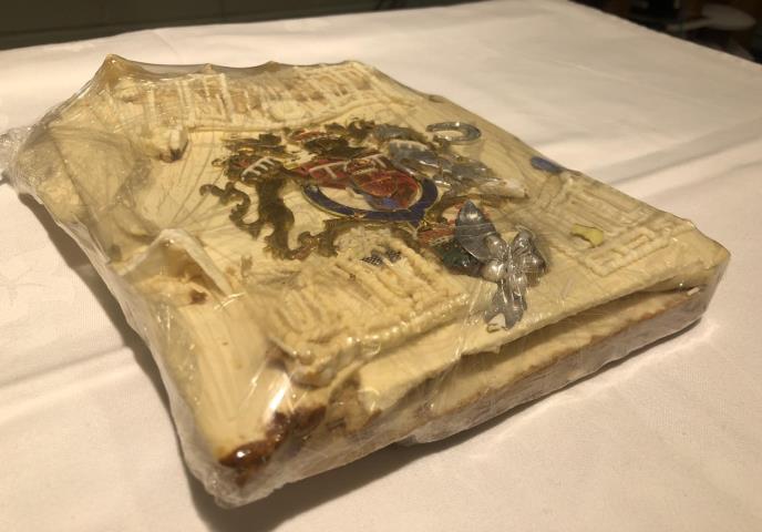 Kolač pokriven belim filom, "malo napuknut" ukrašen je šećernom verzijom britanskog kraljevskog grba, sa lavom i konjem.