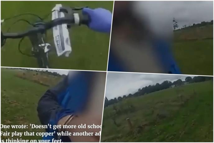 Video snimak sa policajčeve kamere prikazuje kako juri pre nego što pita bicikliste da li može da pozajmi njihov brdski bicikl.