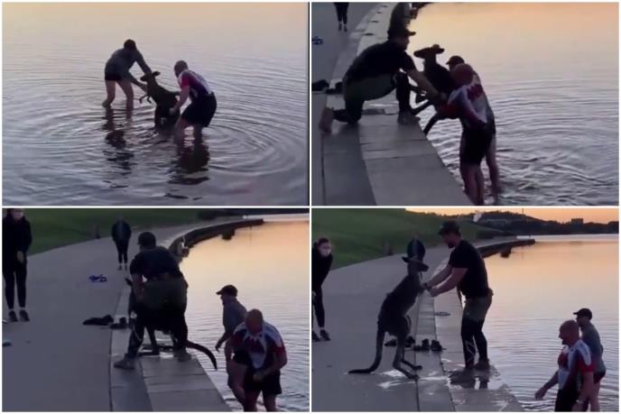 Čim su se spasioci približili, kengur je počeo da maše udovima u strahu, ali uspeli su pažljivo da ga obgrleo i odnesu do obale, gde im je pomogao još jedan muškarac. Uz poglede prolaznika, treći spasilac je kengura smirivao, a zauzvrat mu je životinja, kao znak zahvalnosti, pružila ruku.