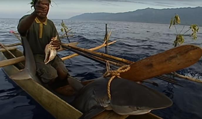 Da bi uhvatili ajkulu u vodama Papue Nove Gvineje, muškarci prvo pevaju. Pevaju imena predaka i tako iskazuju svoje poštovanje prema ajkuli. Tresu zvečkama napravljenim od kokosa i tako mame životinju da izađe na površinu, a onda je hvataju rukom.