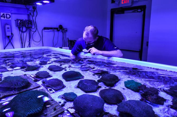 U laboratoriji na Floridi, biolog Eron Gavin pipetama pažljivo hrani škampima više od 700 korala koji žive u ogromnim bazenima sa slanom vodom, dok ogromne lampe koje glume Sunce, sijaju iznad.