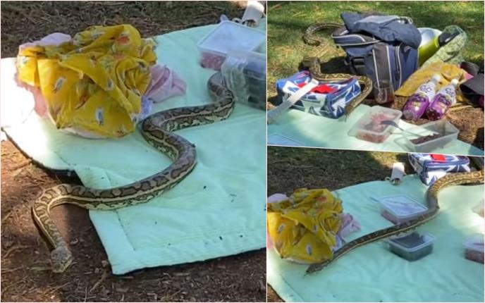 Snimak iz Australije pokazuje džinovskog pitona koji upada na piknik. Grupa je bila prinuđena da čeka i posmatra sa sigurne udaljenosti kako zmija klizi po njihovim stvarima.