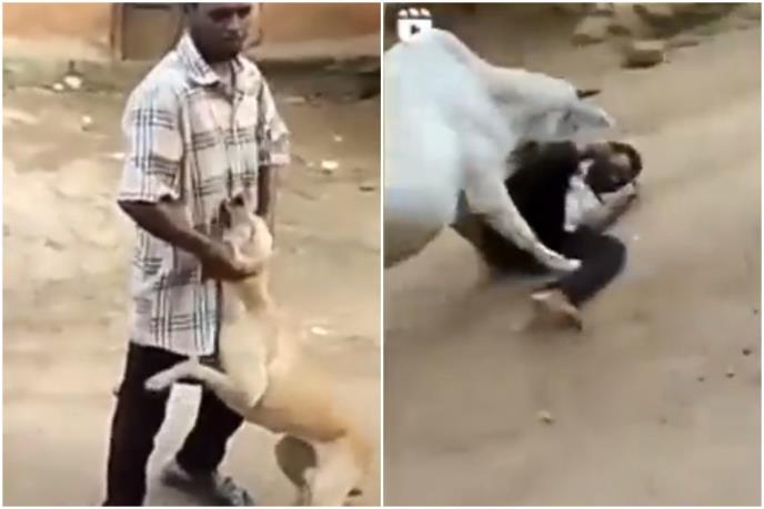 Muškarac je snimljen kako vuče za uši psa koji bolno cvili i kevće pre nego što ga je napao neočekivani borac za pravdu - krava
