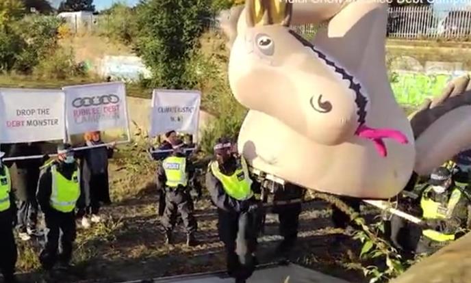 Policiji iz Glazgova pridružile su se njihove kolege iz Skotland Jarda i Metropoliten policije kako bi uhvatili ogromnu igračku na naduvavanje koju su aktivisti porinuli u reku u Glazgovu kako bi pozvali svetske lidere da smanje ili otpišu dugovanja siromašnih nacija.