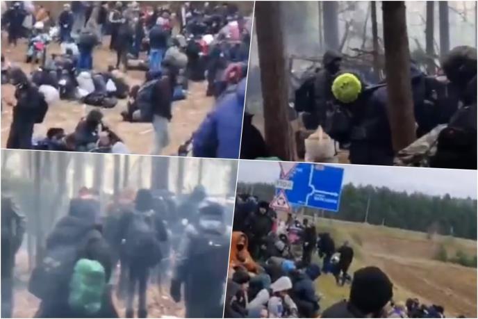 Na snimcima koji su se pojavili vide se naoružani službenici Državnog graničnog komiteta koji stoje sa psima i naoružanjem duž puta i usmeravaju kolne migranata ka šumi i poljskoj granici