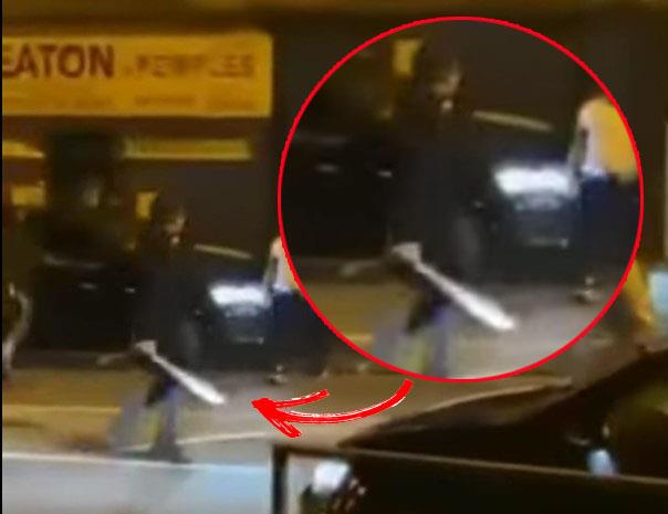 Može se videti automobil kako pokušava da prođe kroz gužvu, ali muškarac stoji na ulici i izgleda da drži veliki nož – navodno mačetu.