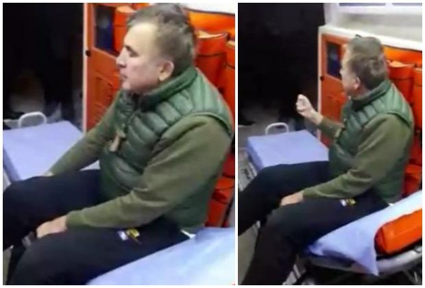 Na snimku iz ambulantnih kola vidi se besan sakašvili kako odgovara lekarima i zatvorskim vlastim ada ne želi dase smiri i optužuje ih da su Putinove sluge.