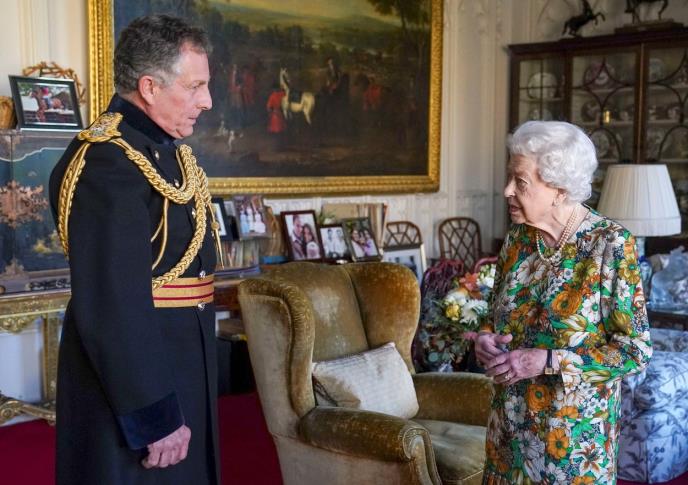 Kraljica (95), obučena u zeleno-narandžasto-belu cvetnu haljinu i sa biserima oko vrata, fotografisana je kako pozdravlja i ćaska sa generalom ser Nikom Karterom, šefom Generalštaba britanske vojske.