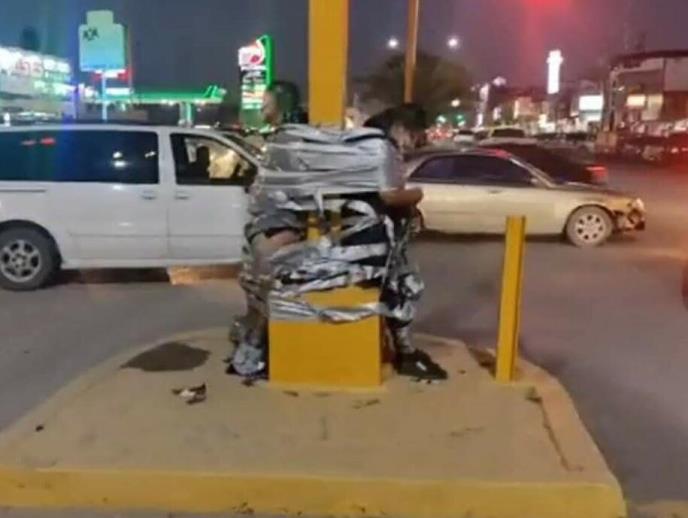 Muškarac i žena koji su optuženi da su ukrali ženi torbu u gradu Rio Bravo, pronađeni su vezani i zalepljeni selotejpom za banderu na raskrsnici grada u blizini granice sa Teksasom.