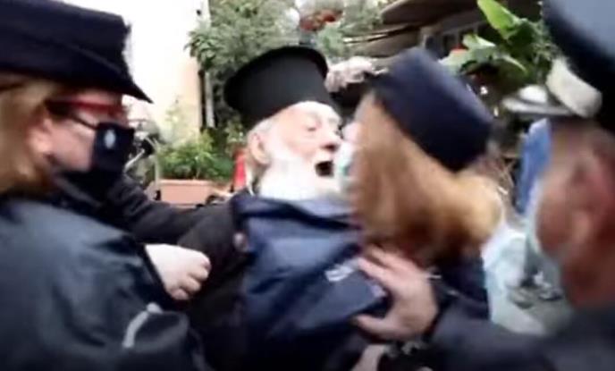 Na snimku se vidi kako muškarac duge bele brade, koji je bio odeven u crni ogrtač i crni šešir, uzvikuje reči na grčkom ispred zgrade, pre nego što ga je policija odvela.
