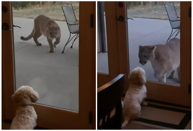 Video prikazuje „veliku, veliku pumu“ kako luta po dvorištu kuće u Grand Lejku u Koloradu. Divlja mačka je došla do staklenih vrata i pomno odmeravala 13-godišnjeg psa ši-pua, po imenu Daš.